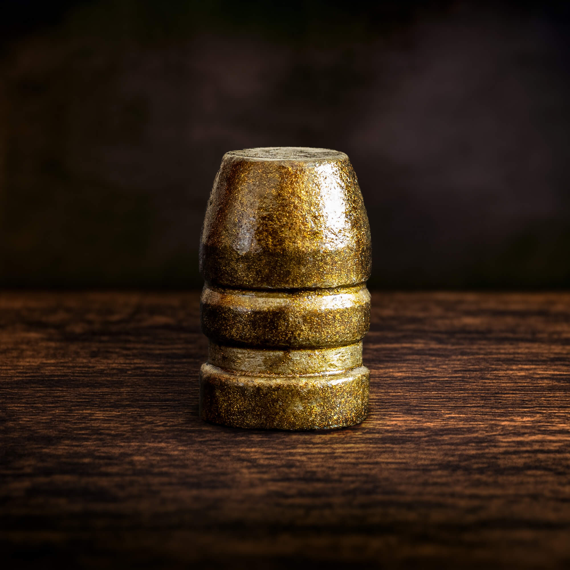 Round Nose Flat Point bullet with a plain base. Available in a choice of polymer coated or a more traditional lubricant.